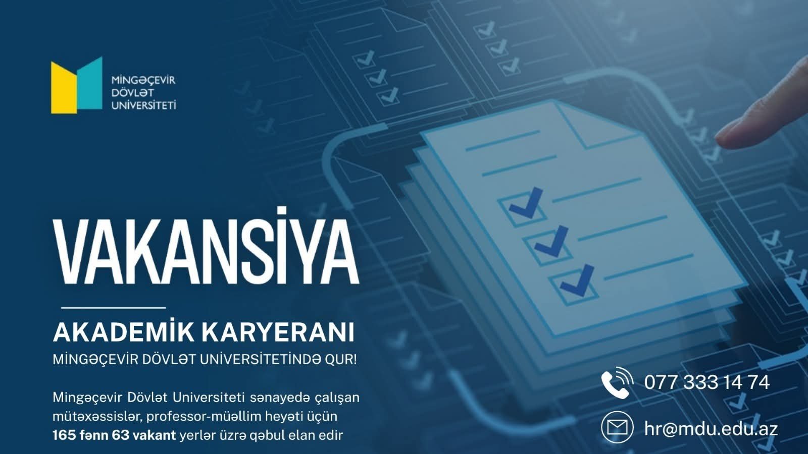 Mingəçevir Dövlət Universiteti (MDU) müxtəlif ixtisaslar üzrə 63 vakant yer üçün müəllimlərin işə qəbulunu elan edib. Bu barədə universitetin rəsmi saytında yazılıb. Belə ki, qəbul 165 fənni əhatə edir və müraciətlər iyulun 12-dək davam edəcək.