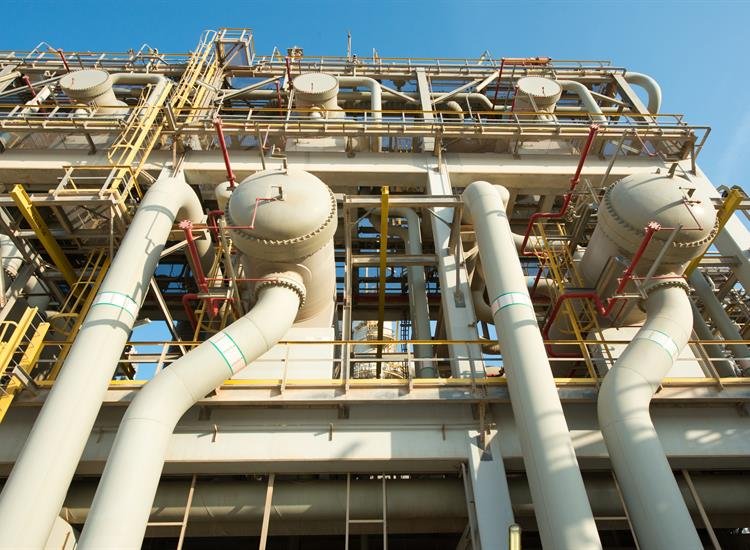 Mürəkkəb metal konstruksiyalar və iri ağ borularla əhatə olunmuş nəhəng mayeləşdirilmiş təbii qaz emalı qurğusu