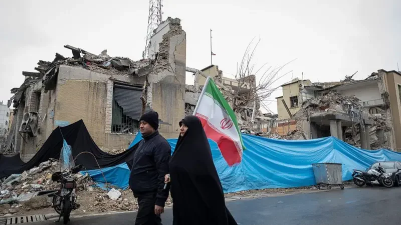 İranlı cütlük Qüds günü yürüşünə gedərkən ABŞ və İsrailin hücumundan dağılmış binanın qarşısından keçir. Tehran, İran.
